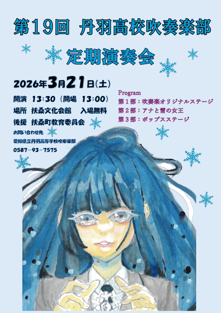 丹羽高校吹奏楽部 第19回定期演奏会のお知らせ✨🎵🎷🎺🥁 2026年2月12日/カテゴリ: お知らせ, 吹奏楽部, 部活動 /作成者: NHD7541DAxumm47丹羽高校吹奏楽部 第19回定期演奏会のお知らせです! 開催日時は令和8年3月21日(土)13:00開場 会場は「扶桑文化会館」です! ぜひ、ご来場ください! 詳細案内はこちら→→→丹羽高校吹奏楽部第19回定期演奏会のお知らせ🎺🎷😊 チラシはこちら→→→第19回定演チラシ🎵 https://niwa-hs.jp/wp-content/uploads/2026/02/第19回定演チラシ-1-pdf.jpg 1497 1058 NHD7541DAxumm47 https://niwa-hs.jp/wp-content/uploads/2019/06/logo-1-300x138.png NHD7541DAxumm472026-02-12 19:34:182026-02-12 19:35:31丹羽高校吹奏楽部 第19回定期演奏会のお知らせ✨🎵🎷🎺🥁